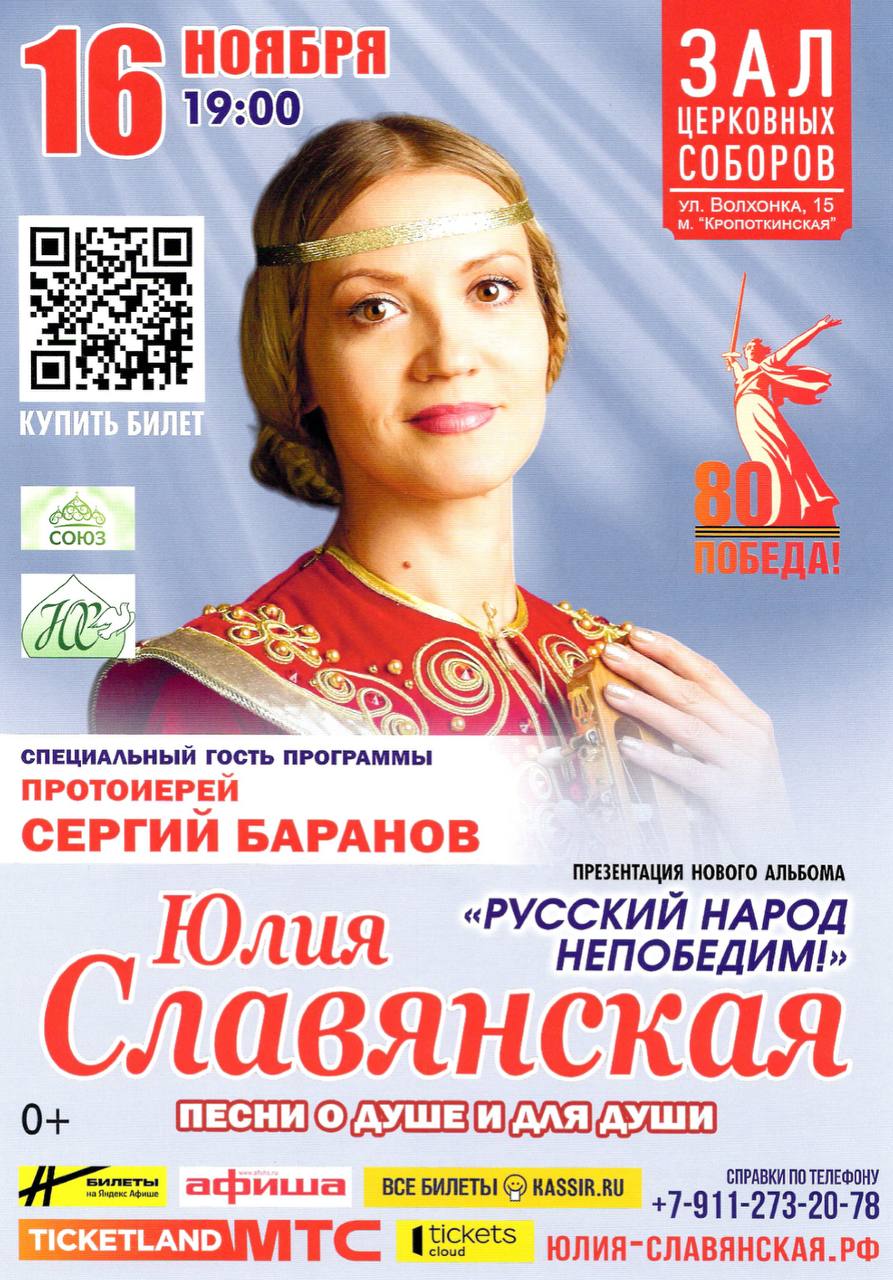 16 ноября 2025 года в Зале Церковных соборов Храма Христа Спасителя состоится сольный концерт певицы Юлии Славянской «Русский народ непобедим!»